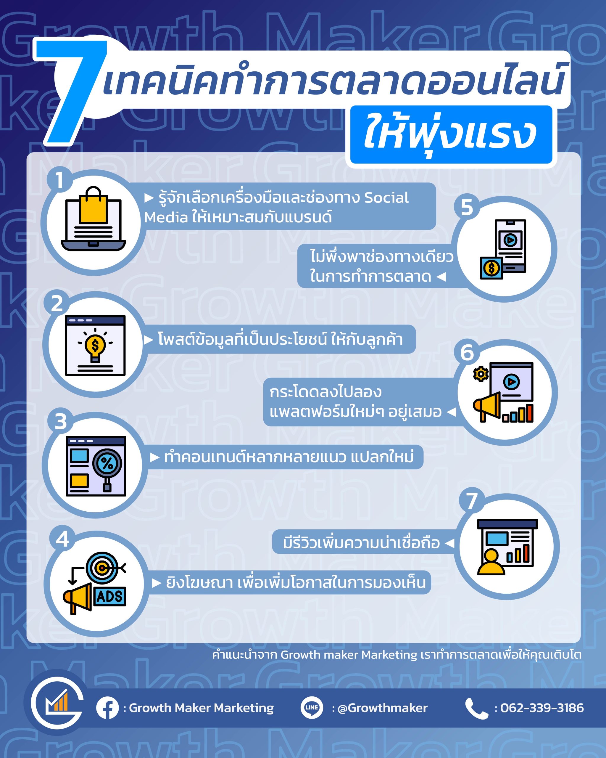 วันนี้ Growth Maker Marketing อยากจะมาแนะนำ 7 เทคนิคการตลาดออนไลน์ ที่จะทำให้ธุรกิจของทุกท่านนั้นรุ่งและพุ่งแรง!!